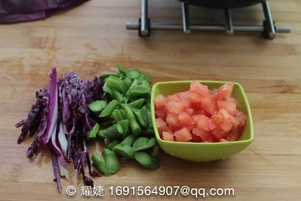 3.芥兰梗斜刀切小段,番茄切小粒,紫甘兰切丝,洋葱切丝。