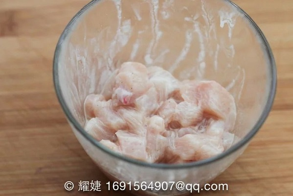 2.鸡胸切小粒,用料酒、干淀粉腌制片刻。