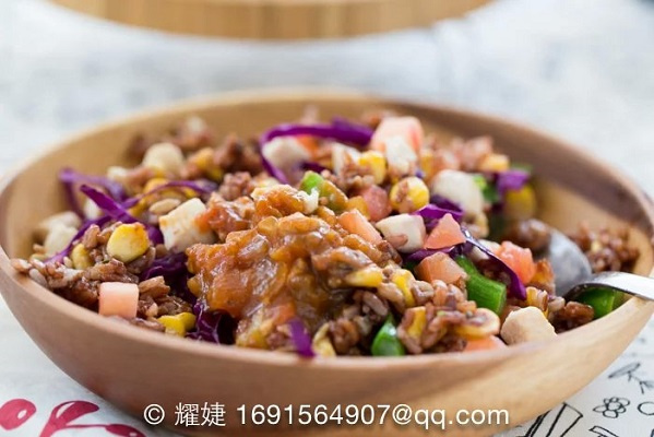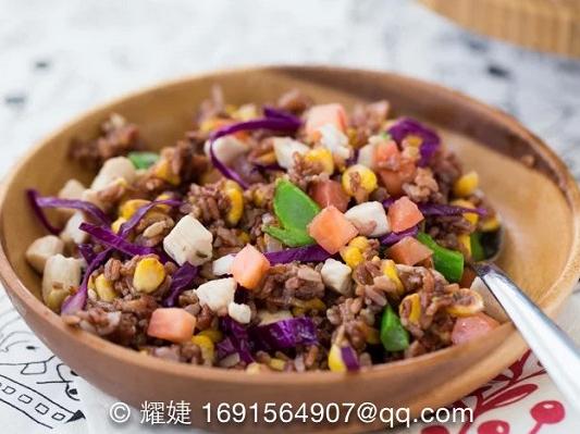 用到了红米、鸡胸、玉米、芥兰梗、番茄、紫甘兰、洋葱,如果再加一点菌类和坚果就更好了。
