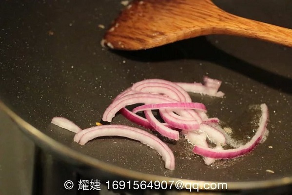 5.炒锅中留底油,油温至五成热时,放入洋葱丝煸香。
