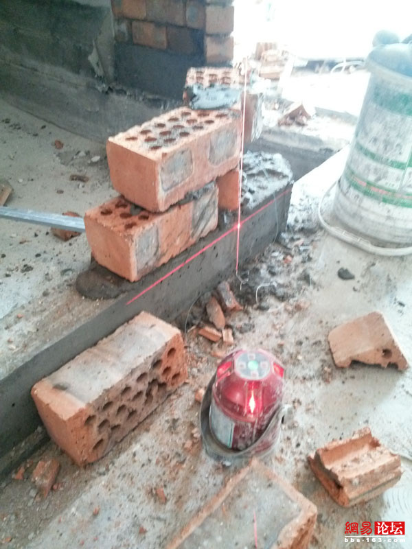 在现场我发现了泥匠师傅身边一个红色的现代化工具,这工具射出的红外线能纠正砌墙的垂直和水平程度。见下图: