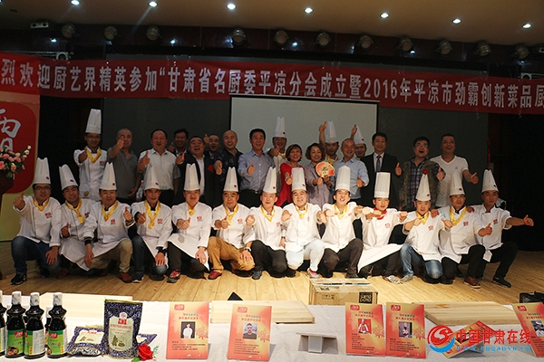 中国甘肃在线9月24日讯(记者:马来虎 张耀忠)9月22日晚,甘肃省名厨委平凉分会成立暨2016年平凉市劲霸创新菜品厨艺交流会在平凉宾馆举行。甘肃省名厨委员会常务会长张建新,甘肃名厨委员会执行会长高德前,甘肃名厨委员会常务会长隋长滨先生,甘肃名厨委员会常务会长陈贵清先生,甘肃省名厨委员会秘书长及股东嘉豪食品有限公司甘青藏区域经理康丽雅出席了会议,平凉分会200余名厨师及厨届知名人士参加了成立仪式。