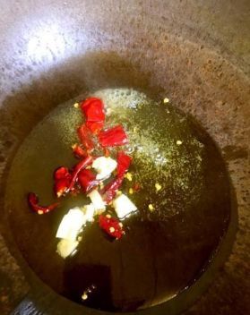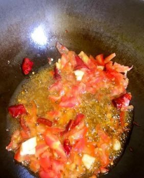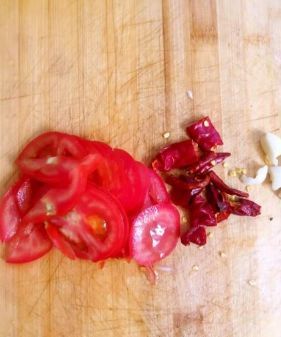准备大蒜拍碎,干辣椒切段,西红柿切片