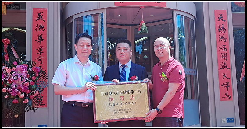 (特约嘉宾赵长安会长为天盛酒店颁发示范店牌匾)