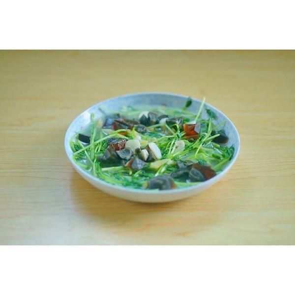 材料:豆苗250g、皮蛋1个、蒜5瓣、生姜3片、盐、胡椒粉、鸡精少量;