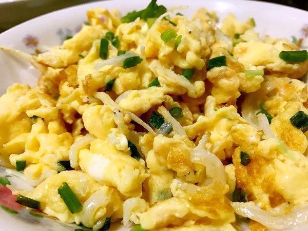 5.轻炒至蛋液凝固;撒少许水,加一点点盐,1克不到,撒上葱花装盘;