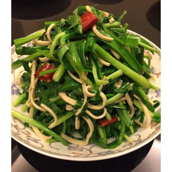 2.炒锅加油烧热放入干辣椒炝锅,放千张丝和韭菜煸炒,加盐,炒韭菜变软即可出锅;