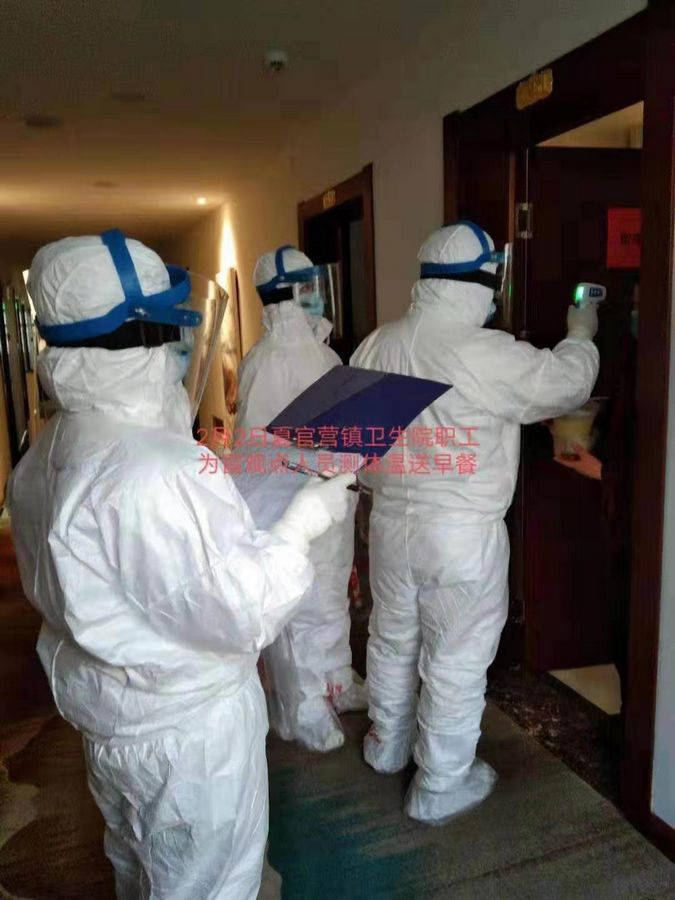 到了大年初二,疫情形势更加严峻,经了解又有一名来自湖北疫区的人员在夏官营。面对疫情,她毫不退缩,就像听到吹响了冲锋号的战士一般冲在前面,对该人员经过一系列科学检测后,确定为疑似病人,于是夏官营卫生院紧急开设了发热门诊,确定隔离区和隔离点。唐敏和同事们穿戴口罩、鞋套、手套、护目镜、防护服,全副武装进入隔离区,对隔离人员进行全面检测,统计密切接触者,给隔离人员送餐,测体温,处理各种生活和医疗垃圾。面对来势汹汹的新型冠状病毒肺炎疫情和紧缺的防护物资,唐敏和同事们一天尽可能的少吃少喝。晚上10时,交接班。从隔离区出来的唐敏目镜里全是雾水。脱下目镜、口罩、手套和不透气的防护服,脸上留下一道道深深的勒痕,变得肿胀、苍白……这些白衣战士们,全副武装值班七、八个小时,不能喝水,不能上厕所,还要不停歇地来回走动、护理、操作。汗水、饥渴、劳累,病毒无时不侵袭着她们的躯体。即便如此,当听到全国各地的医务人员积极请战支援武汉时,她和同事们向组织积极报名请战,请求参加医疗队去支援武汉。面对家人的担心,她编织善意的谎言。面对疫情的无情,她义无反顾地奔赴“前线”战斗。在这个没有硝烟的战场上,唐敏是一名勇敢的白衣战士,她和她的同事们用双手载起生命的重托,用血肉之躯构筑抵抗死神的防线。