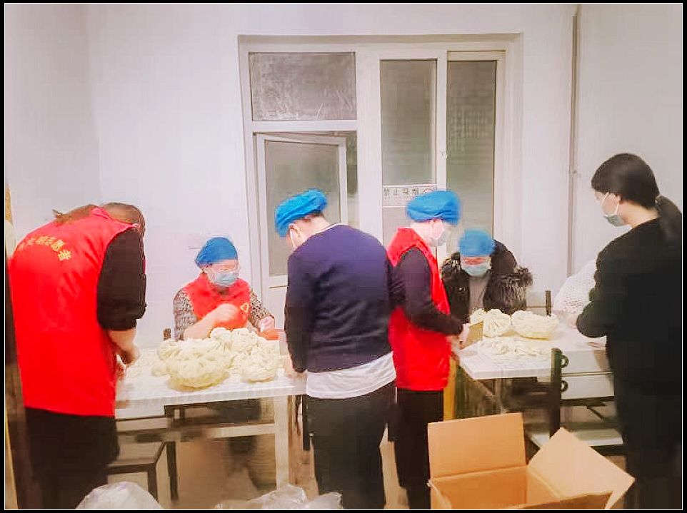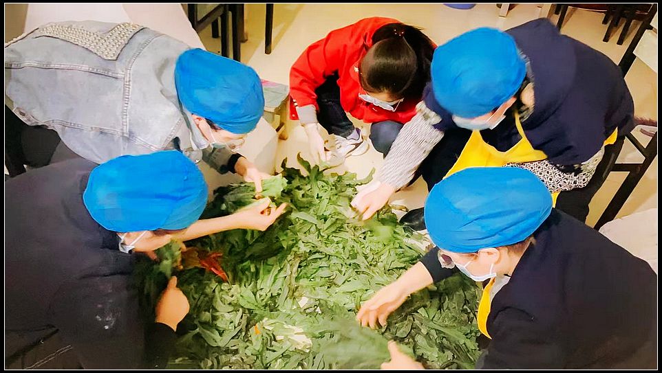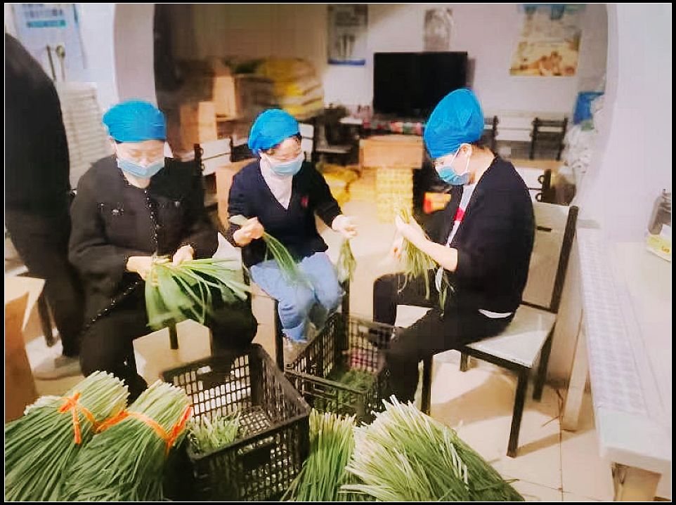 生活和后勤保障党小组的医护人员给食堂帮忙、修理医院凳子。此刻,大家是一家人。