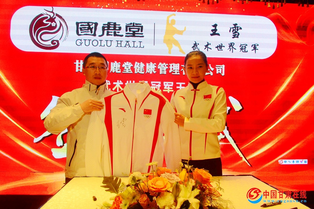 (武术世界冠军王雪为甘肃国鹿堂总经理刘武昌赠送冠军颁奖服并现场签名)