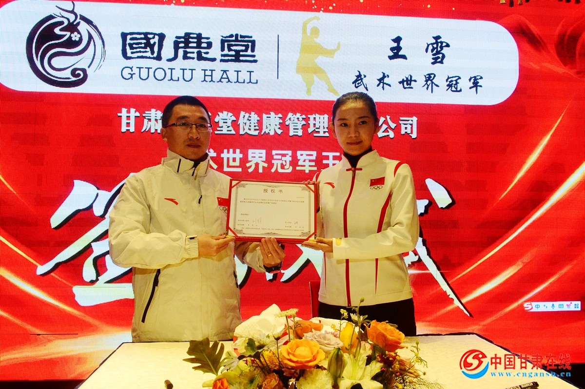 (武术世界冠军王雪颁为甘肃国鹿堂总经理刘武昌发了授权书)