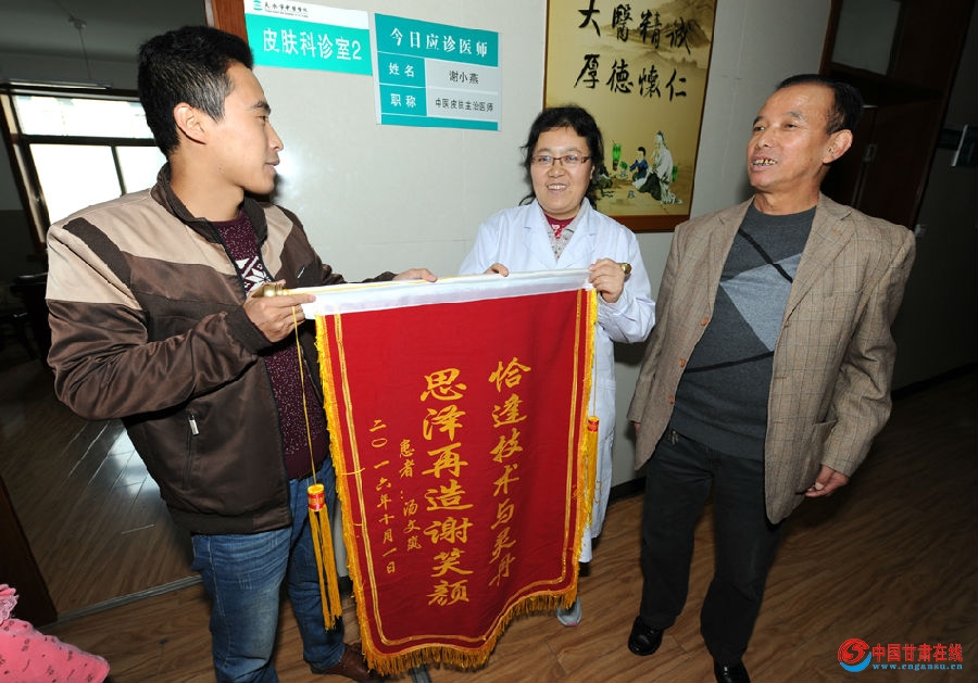 中国甘肃在线讯 “十分感谢谢医生,我的顽固性银屑病经过您的中医治疗,病情好多了,长期以来困扰我心里的病这次是彻底好了,真格太感谢了!”10月26日,家住麦积区社棠镇甘绒小区的患者汤文岚拿着“恰逢技术与灵丹,思泽再造谢笑颜”的锦旗和感谢信来到天水市中医医院皮肤科对主治医师谢小燕高兴地说。