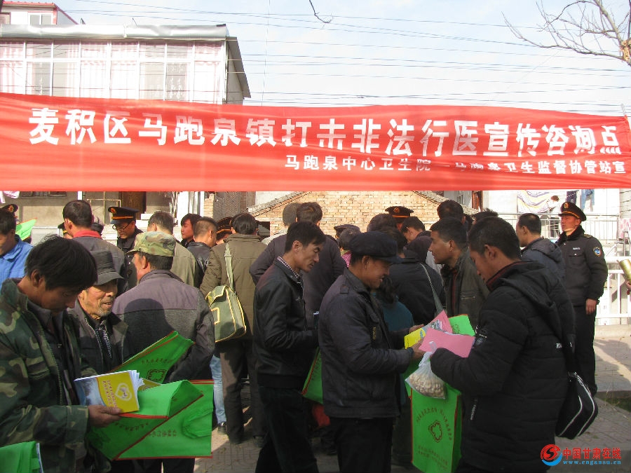 中国甘肃在线讯 (天水市麦积记者站:)为进一步打击非法行医,维护正常的医疗市场秩序,切实保障人民群众的身体健康和生命安全,马跑泉中心卫生院马跑泉镇卫生监督协管站在天水市综合监督执法局麦积分局的业务指导下,在全镇范围内开展为期一周的打击非法行医专项政治活动。