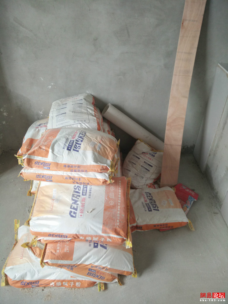 来给我们做仿瓷的师傅说,我们的材料不够。我们只开了腻子粉,胶水,乳胶漆等等。他建议我们还要用些双飞粉。说不用这个的话,以后墙面会起层,墙面也不平。不懂,咨询的其他的师傅说,两样一起用比较好。好吧,买就买的。还顺便给开了阴角线阳角线,刷子,牛皮纸等等。又是一小车。