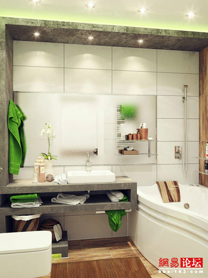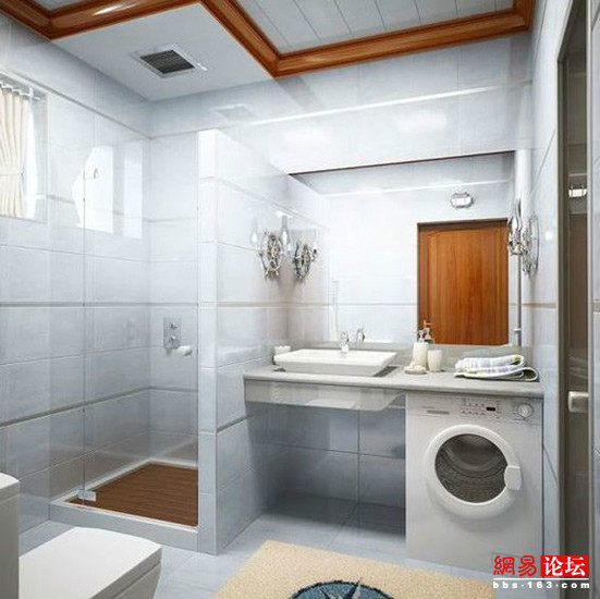 点评:把洗衣机放置在洗手台平台下方,大大地节省了卫浴的空间,也保持了外观上的整洁。大面积的方形镜子从视觉上扩大了空间感,玻璃门和吊顶的棕色木条让空间色彩不再单调。
