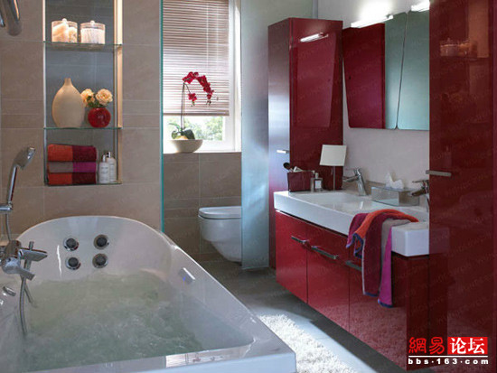 点评:用磨砂玻璃移门隔断坐厕与浴缸,有效地保护了卫生间的隐私。两个方形收纳柜与洗手台相连成为U型收纳空间,暗红色亮面设计非常具有时尚质感,提升了卫浴的活力和格调。
