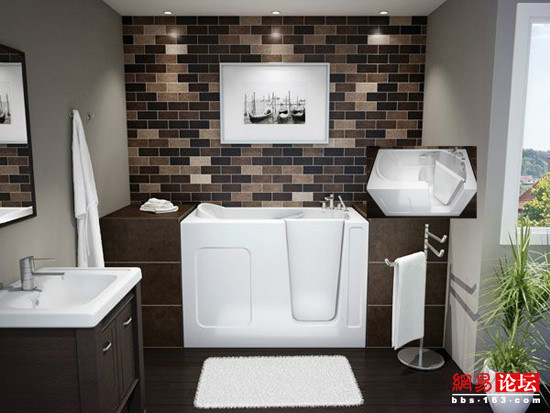 点评:创意的步入式浴缸对于小卫浴来说是一个不错的选择,紧贴墙壁设置节省空间,高高的浴缸外围既安全稳固又有效地防止水外溢,内部还增设了座位平台,十分贴心。方块瓷砖装修的背景墙充满质感,营造了一个舒适的洗浴空间。
