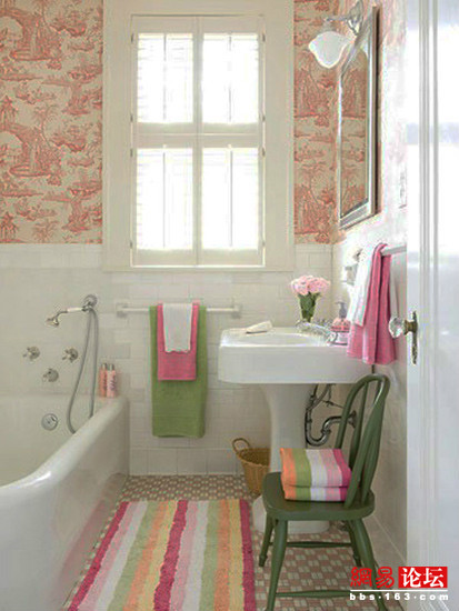 点评:彩色的条纹地毯防滑吸水,色彩跳跃的线条点亮了空间,增添了活力。用墙纸装饰墙壁,大大地美化了背景,更提升了卫浴的整体格调。