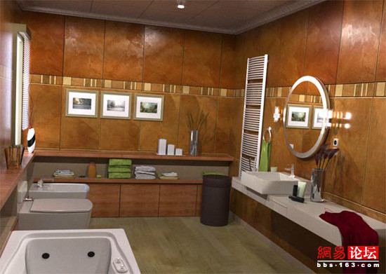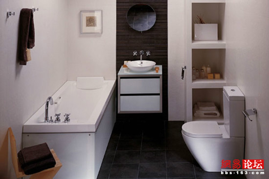点评:该卫浴选用了小型的洗手台、浴缸和坐厕,而且紧贴墙壁和地面设置,中部空出了充足的活动空间,卫浴看起来更加整洁和宽敞。