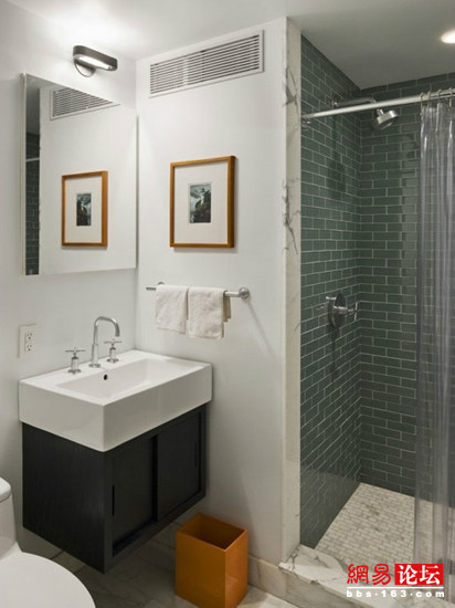 点评:绿色瓷砖背景的淋浴室,白色背景的洗手台和坐厕,分界线利用大理石瓷砖和塑料浴帘使其突出,利用颜色和梯级进行干湿分区,在视觉上更明显也更美观。