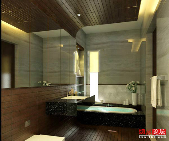 点评:木质的吊顶、镜子背景墙与地板相连成为充满质感的U型空间,转角位的弧度设计让空间显得柔和圆润且富有动感。悬浮的大理石洗手台显得十分轻盈。