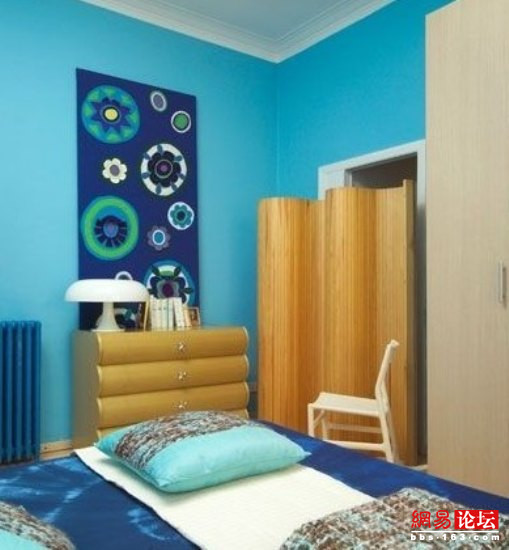 饱和的蓝色让卧室看起来很清爽,半透明的纱帘更增强了这种清爽感。
