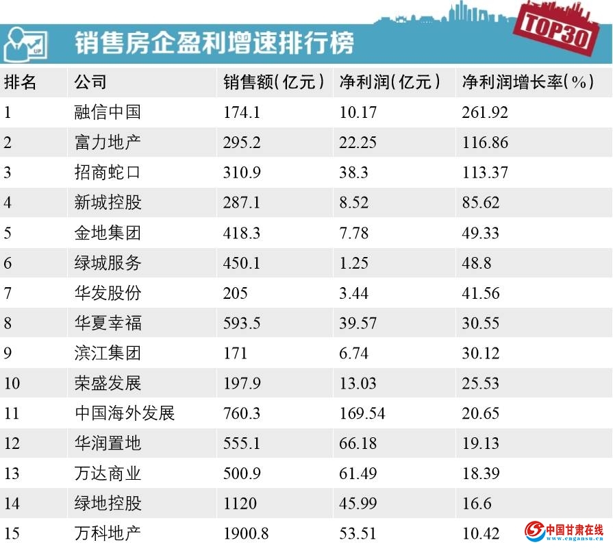 30强房企盈利排行榜中,净利润同比增幅达3位数的房企有3家,分别是:融信中国(净利润上涨261.92%)、富力地产[-0.12%](净利润上涨116.86%)、招商蛇口(净利润上涨113.37%)。