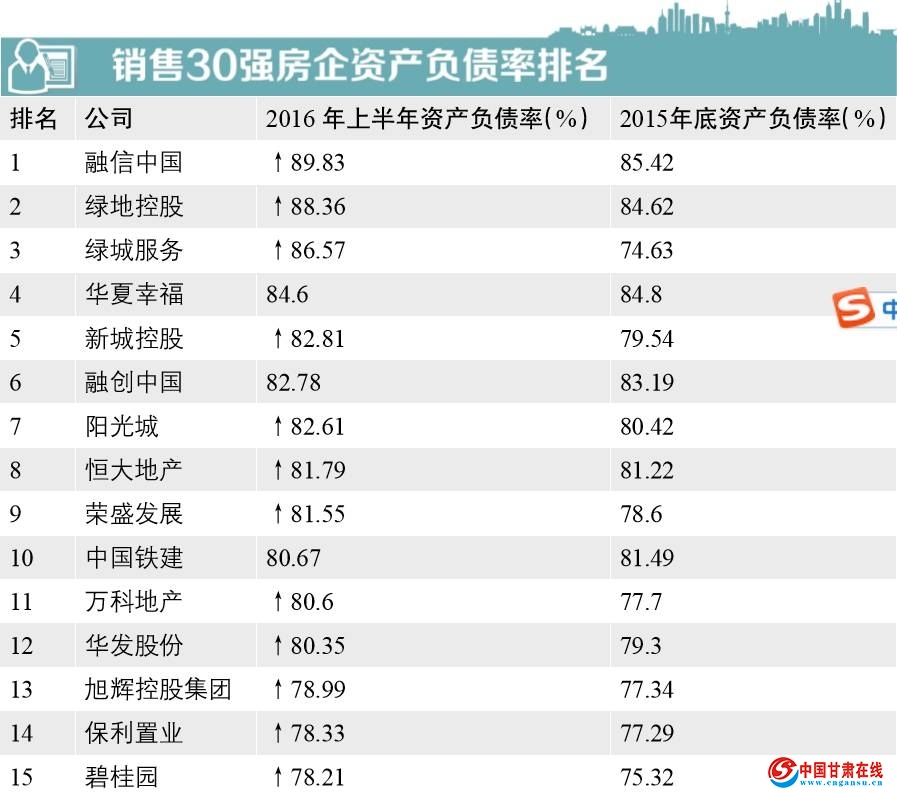 负债率最高的房企仍是融信中国。上半年资产负债率为89.83%,较去年年底85.42%的负债率增加4.4个百分点。绿地控股的资产负债率则由2015年底的84.62%增加到了上半年的88.36%。万科地产、中国铁建[-0.44% 资金 研报]、荣盛发展[0.14% 资金 研报]、绿城服务、新城控股的资产负债率均超过了80%,而在2015年底他们的负债率还在80%以下。