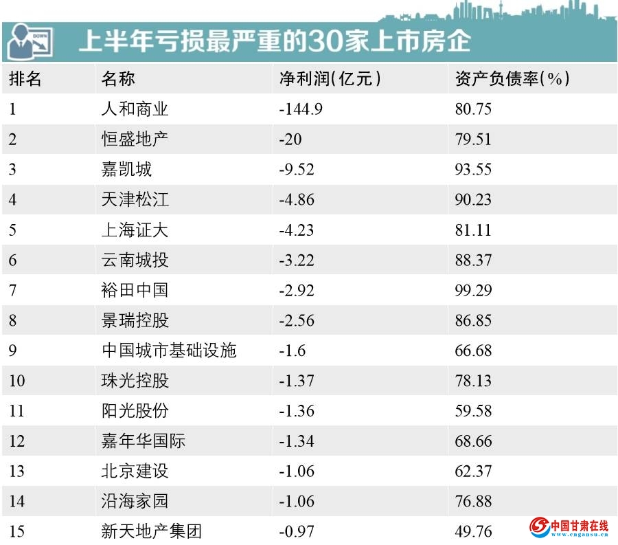 据中国房地产报记者统计,上半年亏损最为严重的上市房企是人和商业[-1.32%]控股有限公司,上半年亏损了144.9亿元;排在其后的恒盛地产[-1.16%]上半年亏损了20亿元;排在亏损榜第三位的嘉凯城[-3.49% 资金 研报]上半年亏损9.52亿元,资产负债率更是高达93.55%,利息支付倍数为-59.41%,显示嘉凯城目前营业收益甚至远远不足以偿付借款利息。