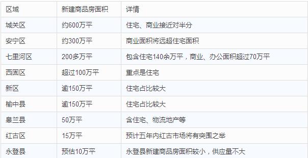 据兰州搜狐焦点网预估,2016年兰州三县六区新建商品房面积将突破1500万平方米,主城四区即城关区、安宁区、七里河区、西固区将是兰州新建商品房供应主力。