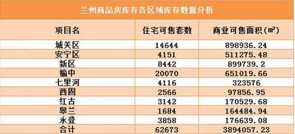 1.榆中库存套数占比最大,为20070套,占比32.02%;其次是城关和新区,占比分别是23.37%和13.47%。