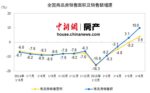 中新网7月16日电 (房产频道 陆肖肖)在国家出台一系列调控政策后,楼市仍难言全面复苏。昨日,国家统计局公布的上半年全国房地产开发和销售数据显示,楼市的各项数据呈现出 “冰火两重天”的两种态势。1-6月份,商品房销售面积同比增长3.9%,销售额也增长了10.0%。与之相对应的则是,6月份房地产开发投资增速的16个月连跌,和楼市库存的再次增长。