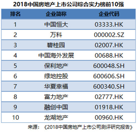 根据2018中国房地产上市公司测评研究报告,中国恒大首次荣膺上市房企综合实力榜桂冠,万科、碧桂园分列二三名。中国海外发展、保利地产、绿地控股、华夏幸福、富力地产、融创中国和龙湖地产分列“2018中国房地产上市公司综合实力榜”第四至十位。