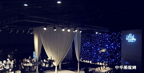 本场婚礼的主题色彩是一黑一白,这本身是传统婚礼的禁忌色彩,但是通过星星点点的蓝光营造,别有一番光影交织的夜空景象。在舞台的设置上,策划师设计了一座8米高、直径6米的仪式园亭作为婚礼主舞台,园亭中央用了将近1000个黑白水晶水滴来替代传统的水晶灯作为装饰,非常别致大气。通过四周全是蓝色星空的塑造,更加呼应舞台处白色纱幔的纯净圣洁。