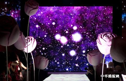 这场婚礼要为新人营造童话梦境一般的婚礼场景,通过高科技背景的变幻来表达,蓝色月光、教堂、大朵盛开的玫瑰花之路等。策划师将美国著名的电视剧《Moonlighting》“蓝色月光”的元素借鉴到婚礼上来,当两位新人互相拥吻时,画面犹如“月光恋人”一样美好,仿佛被定格了一般。可见在背景、舞台效果营造中,花艺设计已然不是唯一的表现手法了,各式光影交织的新技巧新手法应运而生。
