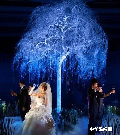 电影《阿凡达》热映之后,影片中那棵精美异常的“生命之树”,备受全球人喜爱。这场婚礼中,新人的主题是大树见证爱情,于是在舞台中变有了一棵同样华丽梦幻、光影交织的大树。在舞台灯光的映照下,大树也散发出“生命之树”拥有的千姿百态,蔚为壮观。新人在舞台中的歌唱等助兴节目也就更为精彩、引人注目。