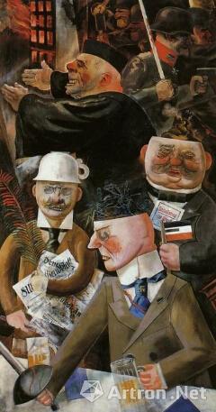 格奥尔格·格罗斯(George Grosz)是一位动乱年代的艺术家。他是柏林达达的重要成员之一,他的艺术实践可说是的“献身讽刺和自嘲以反对已确立并正在延续的事态的事业”的典型。格罗斯的作品以开放的视野与明快的风格,嘻笑怒骂的奔放笔触,淋漓尽致地反映了德国社会生活的各个方面,将一个动乱年代的真相和盘托出。虽然格罗斯被普遍认为是一个现实主义画家,但他并不是一个追求幻真的形似的现实主义画家。他的绘画具体对应了丑恶的现实,对现实作出了充分的个人评价。1933年,在希特勒上台前18天,格罗斯移居美国。他曾经在美国的许多艺术学院任教,并且在1937年和1938年两年连续获得著名的古根海姆奖金。虽然远离了法西斯统治,但他在美国也仍然尽力制作反法西斯的宣传作品,尽一个反法西斯战士的义务。