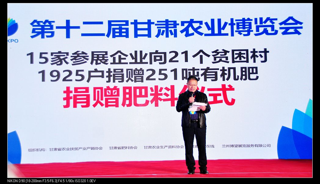 据了解,此展会是由甘肃省耕地质量保护管理总站和甘肃省肥料协会发起倡议,向全省贫困村捐赠有机肥活动,得到了全省肥料企业和农博会组委会的积极响应,15家肥料参展企业向22个贫困村1725户贫困户捐赠251吨有机肥,为我省精准扶贫工作提供了强硬支撑。