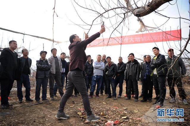 2月27日,延安市黄陵县果业中心技术人员呼华刚(前)为隆坊镇上官村果农进行果园管理培训。春节过后,气温回暖,陕西苹果主产区延安市的田间地头一片劳动景象,广大果农抢抓时节下地备耕。新华社发 (张博文 摄)...
