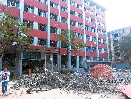 7月20日上午8时许,记者赶到现场,得知事发地点位于城关区会宁路什字的兰州大学医学校区南校区(兰州大学网络与继续教育学院)院内的一栋楼东北角。在事发现场,惊魂未定的李女士向记者介绍,这几天,他们正在拆迁工地旁的一栋宿舍楼上从事粉刷工作。早晨刚起床,突然听到后院一声巨响。大家以为是地震了,第一反应就是往外面马路上逃生避险。