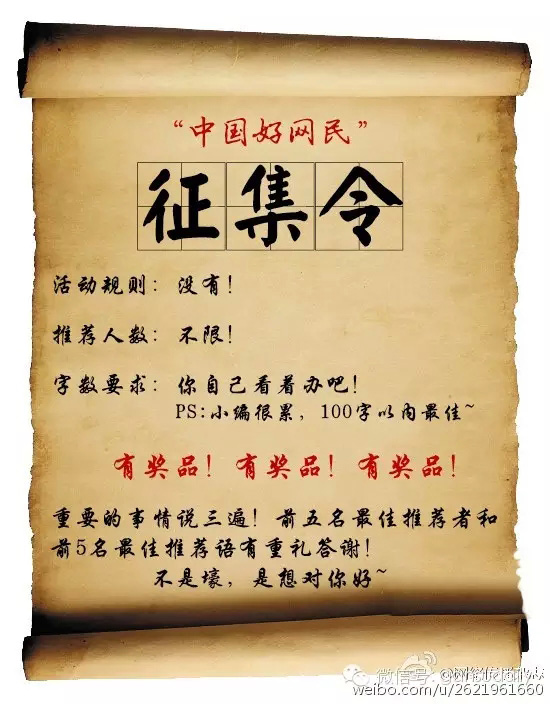即日起,每日甘肃网在网站、官方微博、微信发起“寻找中国好网民弘扬网络正能量”的征集活动,无论是谁,只要你觉得他(她)符合你心目中的“中国好网民”形象的,都可以通过以下方式@每日甘肃网告诉我们!