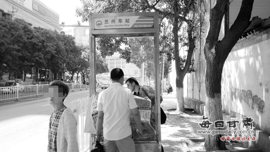 7月7日,兰州市平凉路南段的12路、112路等公交车南行站站牌玻璃被损坏,站牌里面的线路表堆摞在一起。由于看不清线路各站点名称,给一些市民尤其是外地人乘坐公交车带来很大不便。图中的两名市民正在艰难地查找站牌信息。 本报首席记者张继培摄