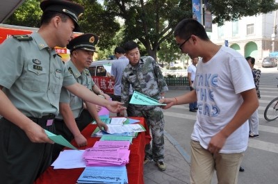 据兰州日报报道 (记者 董永前 特约记者 卫亮 摄) 7月22日,皋兰县吹响征兵“集结号”,2015年征兵工作全面启动,当日,县人民武装部通过印发宣传资料、张贴标语、悬挂横幅、车辆巡回宣讲等多种形式,大力宣传征兵优惠政策、时间安排、报名程序和标准条件等,激发适龄青年参军报国的政治热情,调动优秀青年参军入伍的积极性。此外,皋兰县各镇也设立征兵报名咨询处,并对外公布报名地址和联系电话,同步开展兵役登记、报名和政策咨询工作。