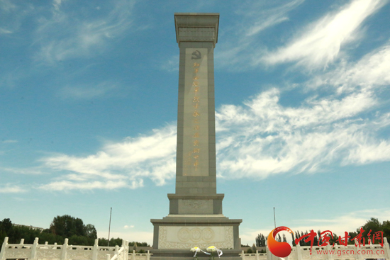 中国工农红军西路军烈士纪念碑,高29.37米。碑身正面上方镌刻党徽,寓意红西路军是中国共产党领导下的一支英雄部队。党徽下方为红西路军第30军政委、原国家主席李先念1987年题词:“红军西路军烈士永远活在我们心中”。本网记者 李秀清 摄