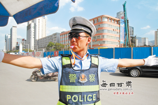 高温下,兰州市街头交警仍坚守在岗位上。本报首席记者裴强摄