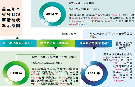 省委省政府决定:从2012年起,按照“看新不看旧、看大不看小、看高不看低”的要求,连续3年对各地所建项目进行高规格、多角度、全方位的现场观摩。