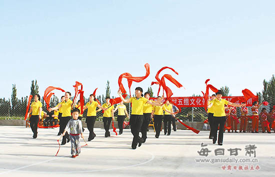 敦煌市转渠口镇爱好舞蹈的村民在广场翩翩起舞。联村联户行动中,敦煌市转渠口镇通过“体育健身、文化健心”的方式,丰富群众文化生活。