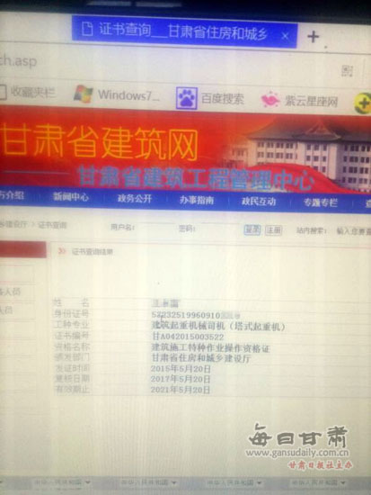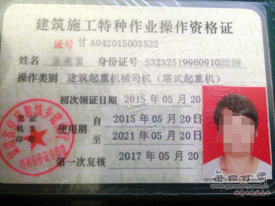 近日,每日甘肃民声315热线接到在新疆打工的陇南网友王先生投诉,称7月份他通过一家名为“甘肃省建筑网”的网站办了一个“塔式起重机操作证”,8月份他在新疆好不容易找到一份塔吊的工作,但是经过当地建设局验证,他的塔吊操作证竟然被告知是假证。接到投诉后,本网记者第一时间与甘肃省住房和城乡建筑厅联系核实,经确认,甘肃省建筑网为非正规网站,工作人员提醒网友莫上当。