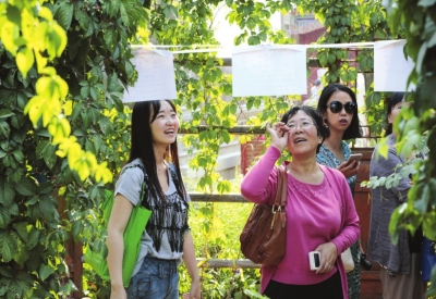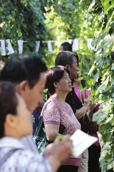 下午2时许,一位男孩的母亲在女区来回转悠着,她时而看看手上的记录本,时而又将目光投向悬挂在葡萄架两侧的资料卡上,好像在核对着什么信息。
