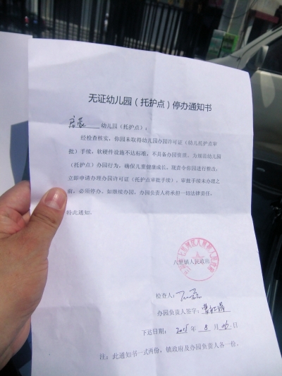 随后,八里镇副镇长宗璞、区教育局李副局长等相关人员,对花寨子村八里镇中心幼儿园、启蒙幼儿园等5家无证幼儿园下发了停办通知书,并告知负责人,在未取得幼儿园办园许可证(幼儿托护审批)手续之前,必须停办。对八里窑村牟家湾农家院作坊式的天恩无证托护点进行取缔,同时还将挂有幼儿园字样的启蒙等无证幼儿园摘牌。宗副镇长表示,启蒙幼儿园暂时将牌子遮挡住,明后天将督促摘除灯箱装饰的牌子。